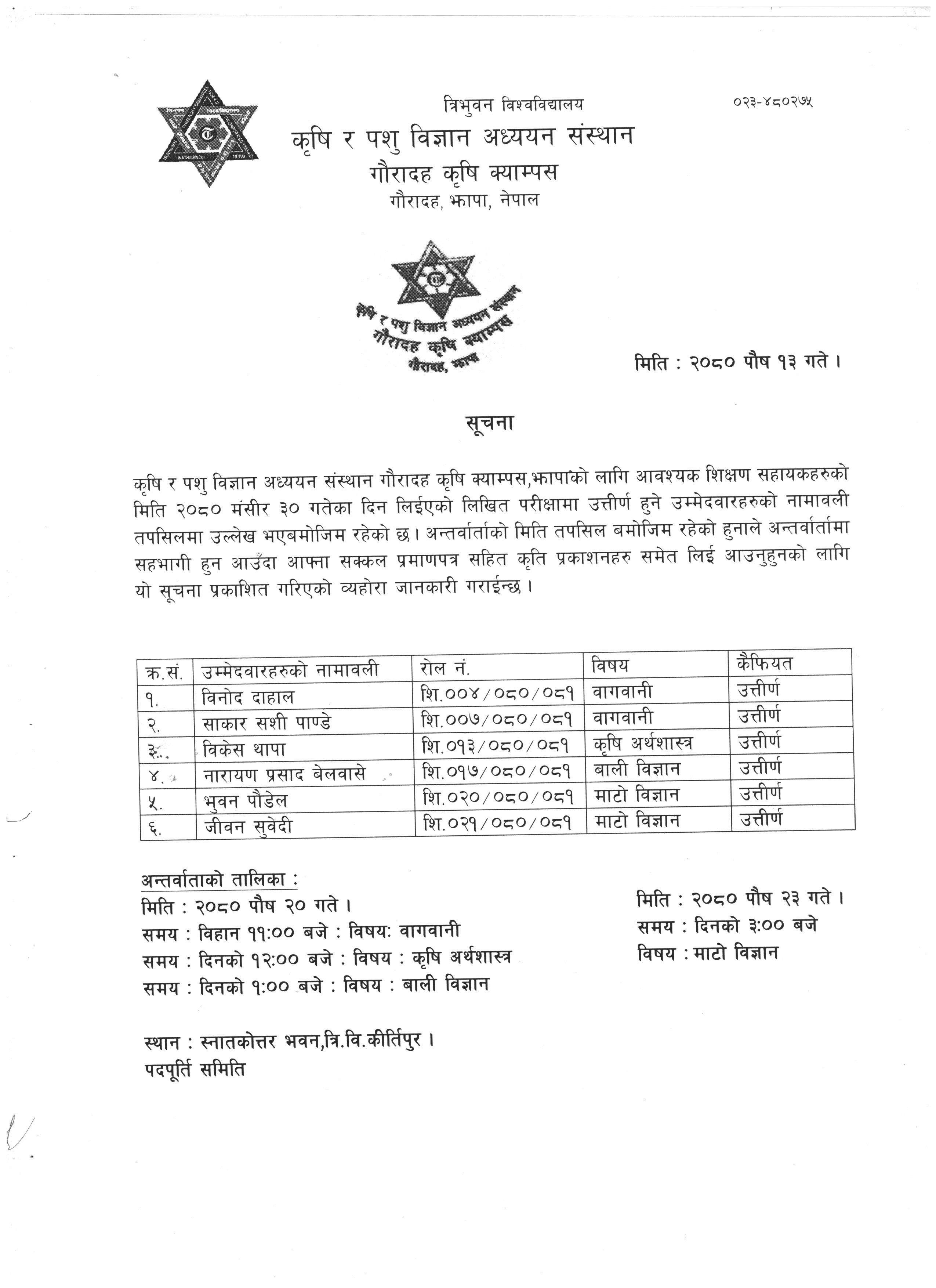 कृषि र पशु विज्ञान अध्ययन संस्थान गौरादह कृषि क्याम्पस, झापाको लागि आवश्यक शिक्षण सहायकहरुको मिति २०८० मंसीर ३० गतेका दिन लिईएको लिखित परीक्षामा उत्तीर्ण हुने उम्मेदवारहरुको नामावली तपसिलमा उल्लेख भएबमोजिम रहेको छ । अन्तर्वार्ताको मिति तपसिल बमोजिम रहेको हुनाले अन्तर्वार्तामा सहभागी हुन आउँदा आफ्ना सक्कल प्रमाणपत्र सहित कृति प्रकाशनहरु समेत लिई आउनुहुनको लागि यो सूचना प्रकाशित गरिएको व्यहोरा जानकारी गराईन्छ ।