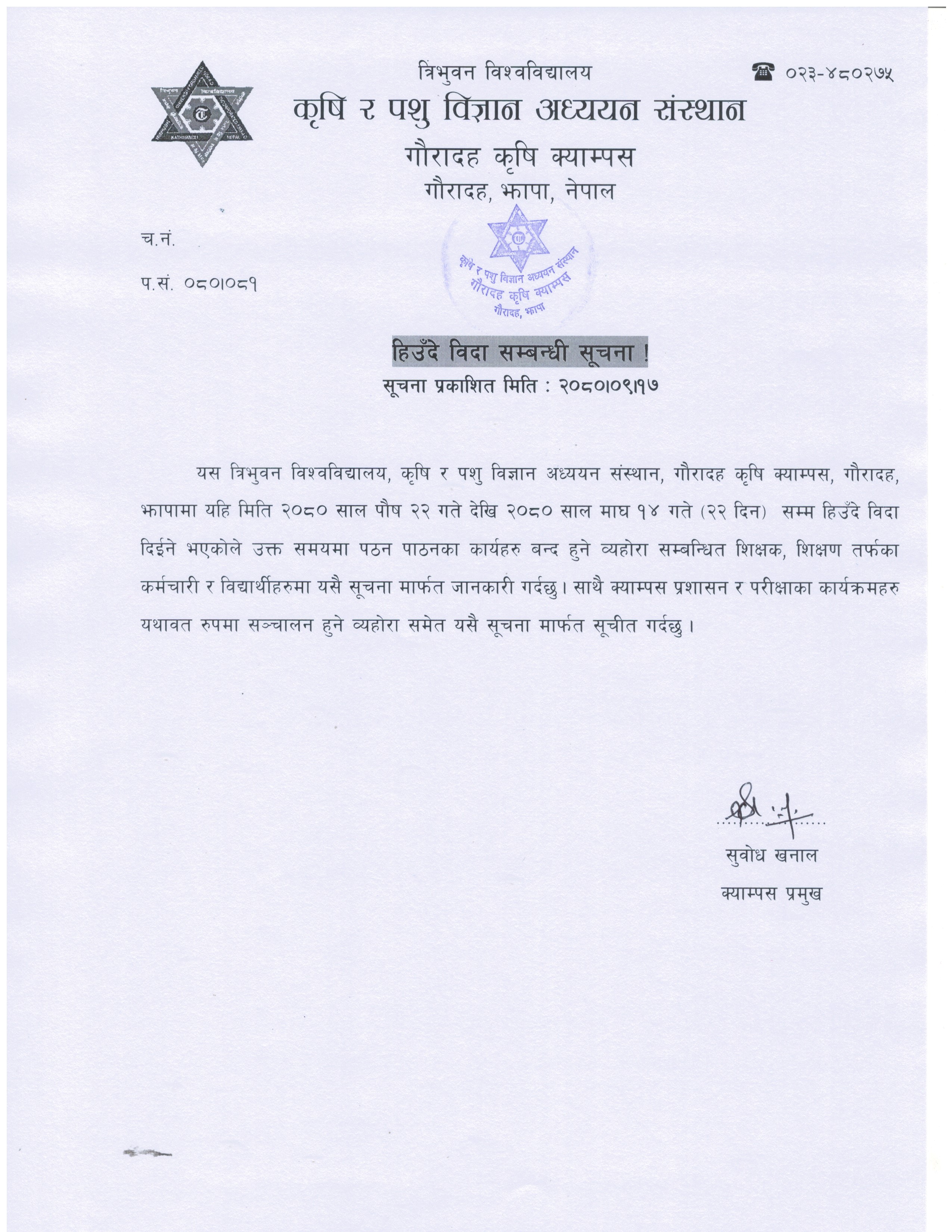हिउदे विदा सम्बन्धी सूचना ।